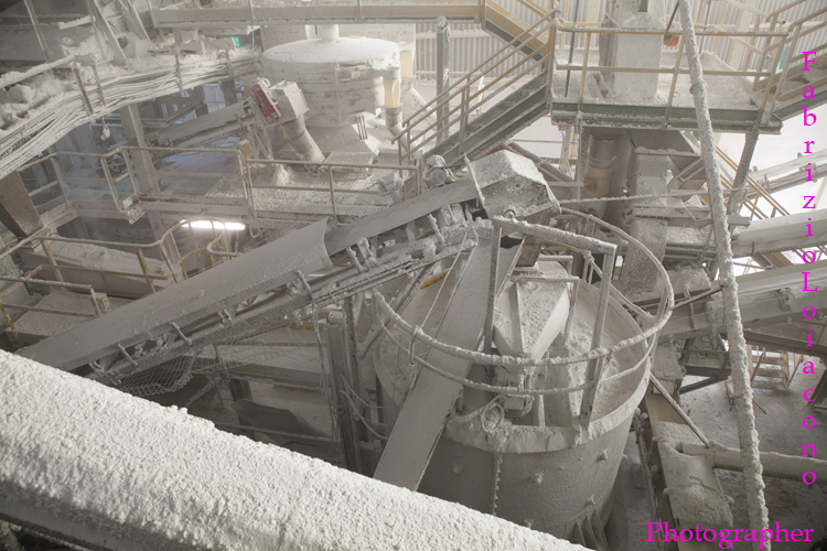 La raffineria. Si deve uscire di nuovo all’aria aperta, al sole accecante e caldo di quest’angolo di Sicilia. La luce qui è vivida, quasi abbagliante, depositi simili a “zucchero a velo” soffice, candido e quasi impalpabile ricoprono ogni dove, macchine, tubi, pavimenti, operai.